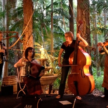 Carol Isaacs (accordion 2009-2024) - a founder member of the London Klezmer Quartet who not only played, arranged and composed on four albums, but designed the artwork for all of them. Carol has performed worldwide on keyboards in a diversity of genres and with a range of artists including The Indigo Girls (US), Sinead O’Connor (Ireland), Natacha Atlas (Egypt), and Ahmed Mukhtar (Iraq). In 2020 she published a graphic novel and motion comic, The Wolf of Baghdad, with which she toured film festivals in Japan, New York, Tel Aviv and Bangkok.